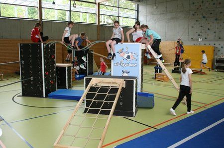 In der 6. Klasse erwartet die Schüler:innen der Milchparkour. Dies ist eine riesige Bewegungslandschaft, die auf der Sportart „Le Parkour“ aufbaut. Sie wird von Profis aufgebaut und betreut. Sie zeigen den Schüler:innen diverse Tricks und Kunststücke, trainieren sie mit ihnen und im Anschluss gibt es genug Zeit, um sie selbstständig im Parkour auszutesten.